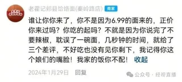 从网友发布的图片中,记者留意到,不少网友反馈面馆的面量少、环境不佳且口味偏咸。令人意想不到的是,老板的回复竟是:“找个安静的环境去吃,不欢迎你!”“你爱来不来,走好,不送!”“没见你死呀!”“咋不咸死你”“你吃不起,我不伺候你了!”