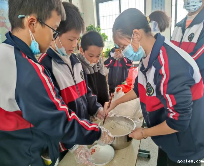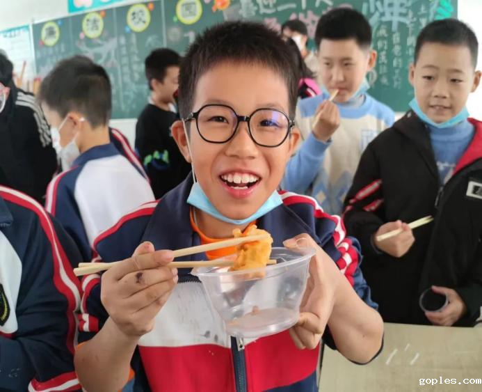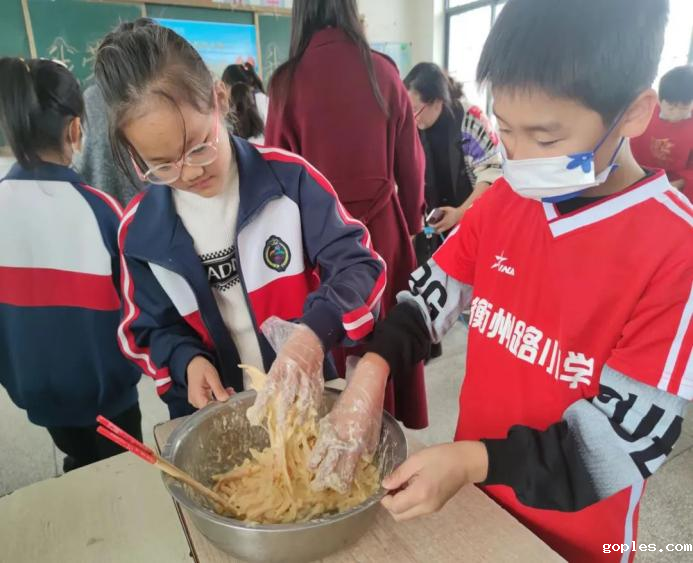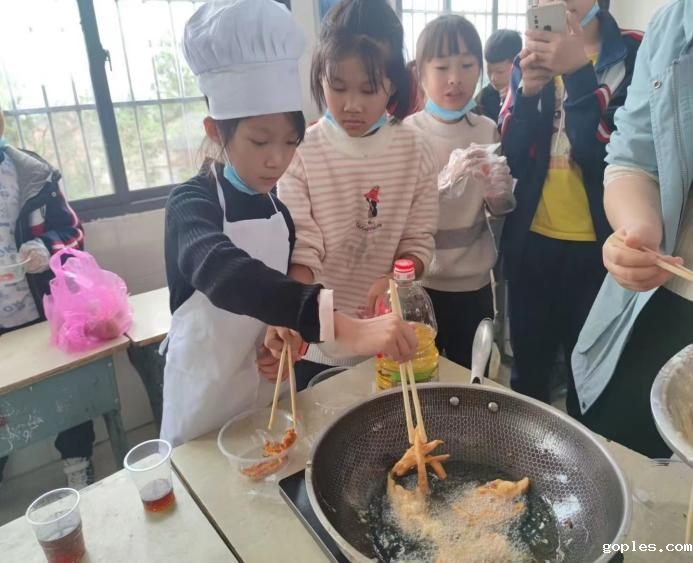 素螃蟹,此螃蟹非彼螃蟹,其实就是炸红薯。因炸出来的形状有些像螃蟹而得此名,这是一道美味的农家小吃。社团的小成员们将红薯洗净切丝,再将红薯裹上面粉、起锅热油……孩子们化身“小厨师”,开启了美食制作的旅程。大家分工细致、井然有序。一切准备工作就绪后,就可以将“螃蟹”放入锅中煎炸,不一会儿,操作间里弥漫着阵阵香味,孩子们都垂涎欲滴,看着锅中金黄色的素螃蟹,一张张充满骄傲和喜悦的笑脸,成了校园里最美的风景。