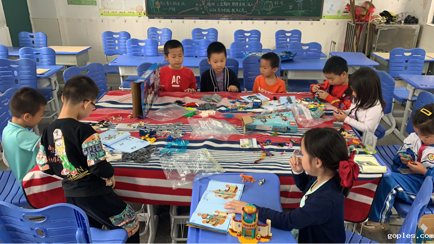 图1:少儿机器人社团小朋友分组合作完成不同项目的搭建