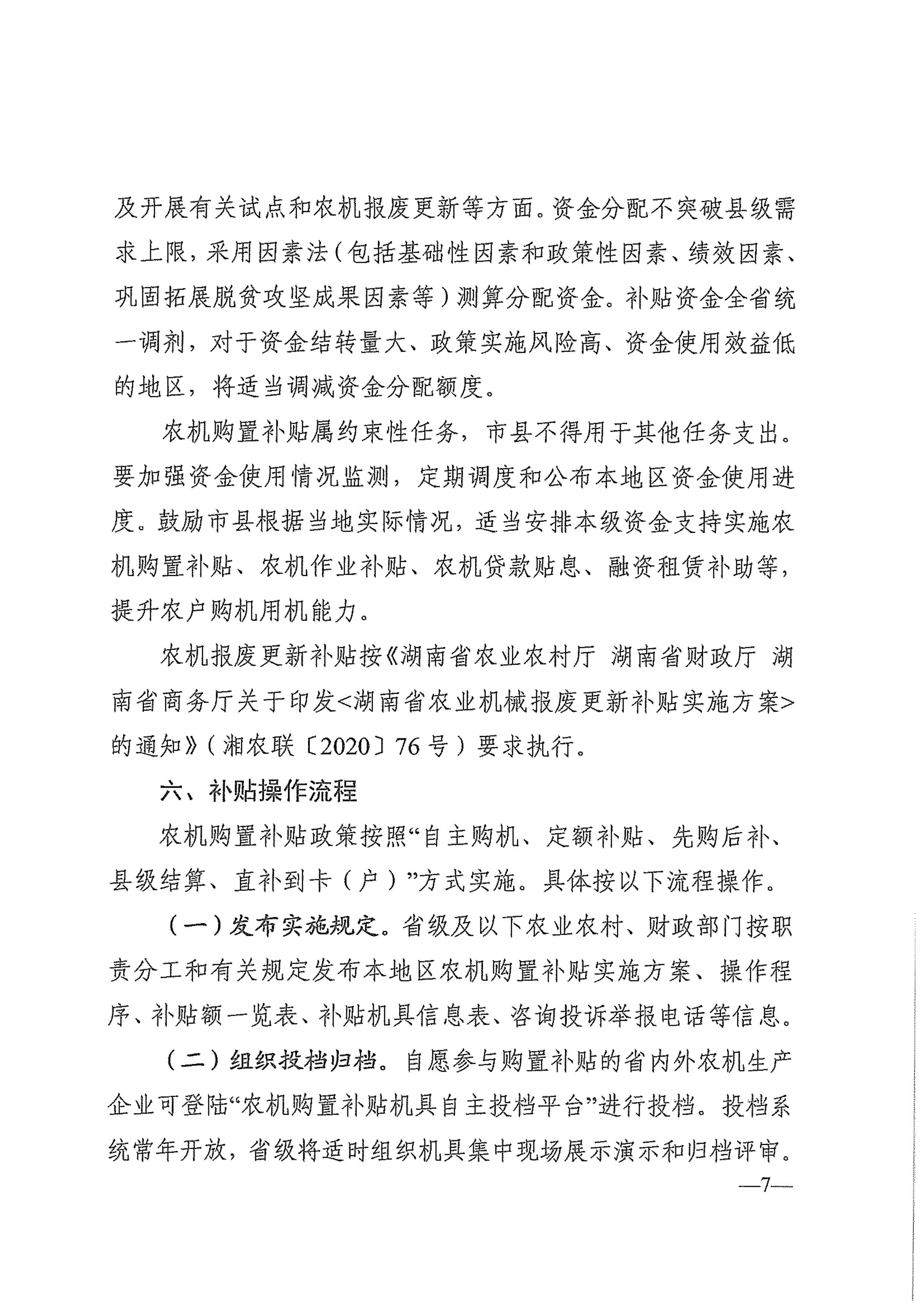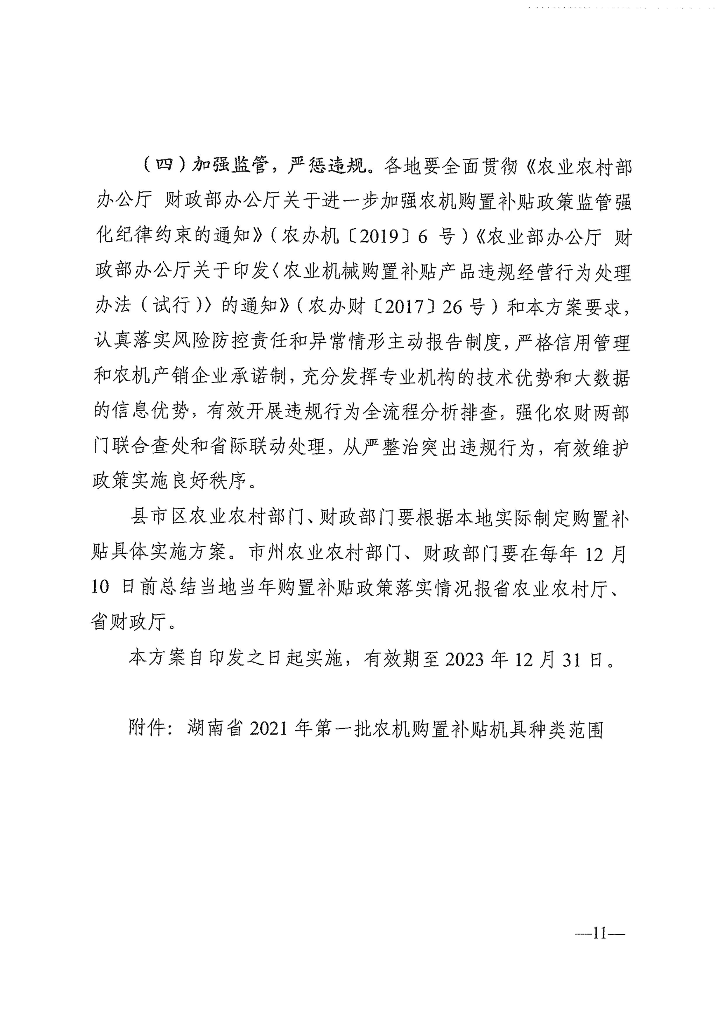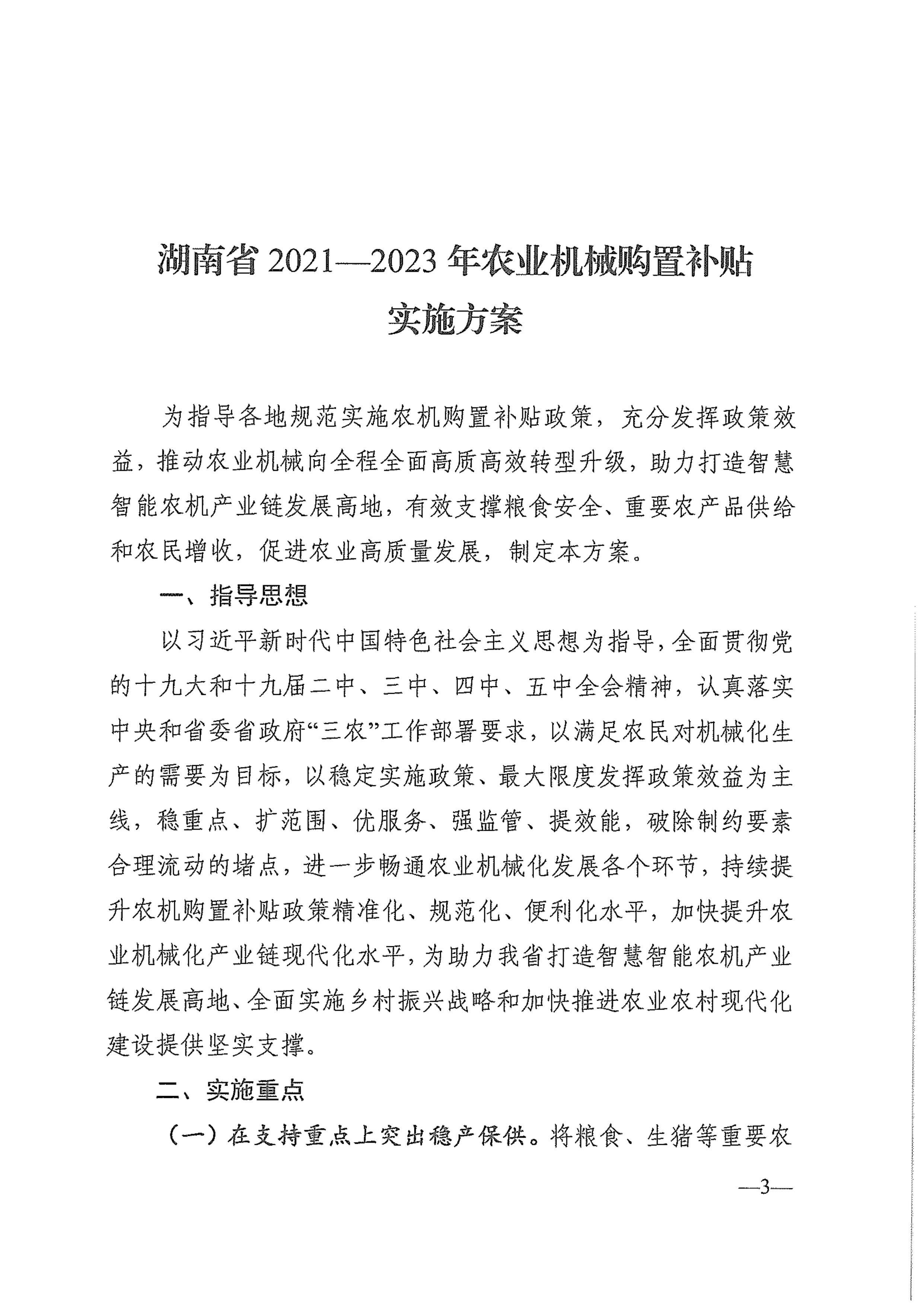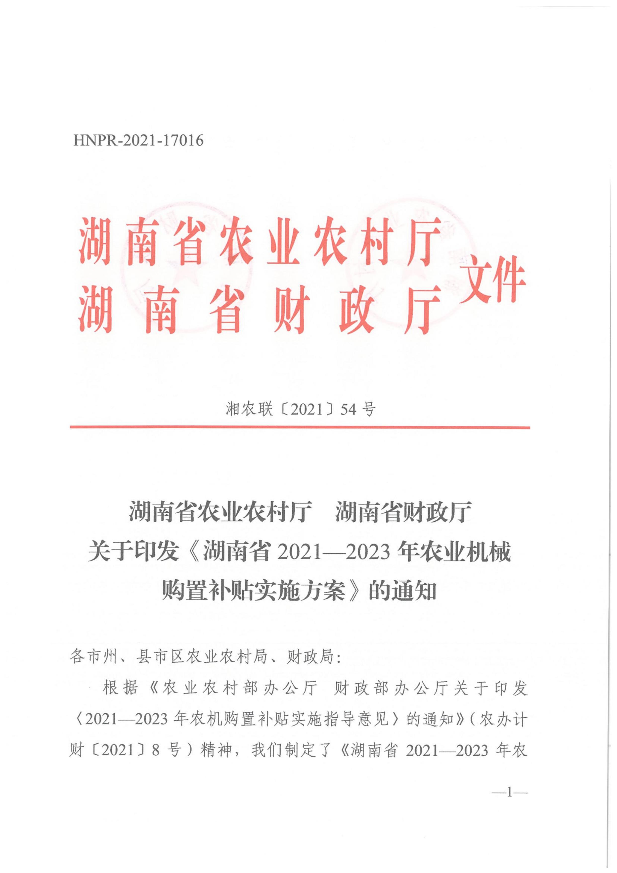 湖南省农业农村厅 湖南省财政厅 关于印发《湖南省2021-2023年农业机械购置补贴实施方案》的通知