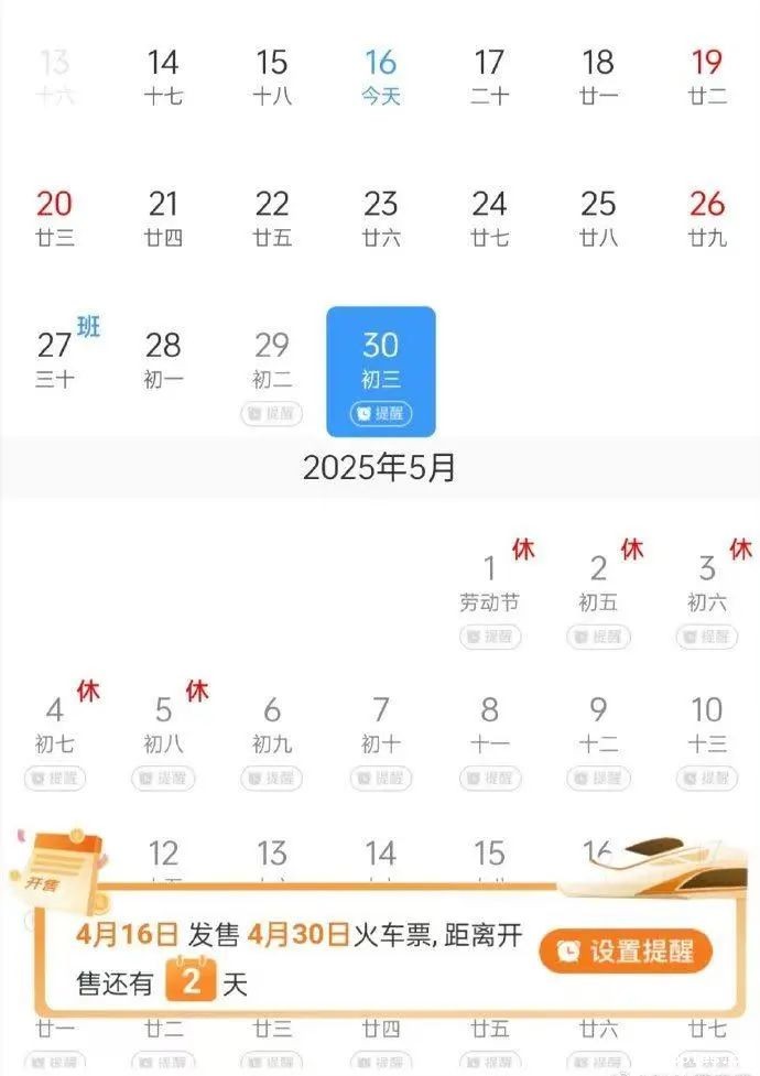 据悉,五一假期前一天(4月30日)的火车票今日正式发售。2025年五一小长假自5月1日至5月5日,共5天。根据目前铁路客票提前15天预售的规则类推,4月17日开售5月1日假期首日火车票;4月21日开售5月5日假期最后一天火车票。