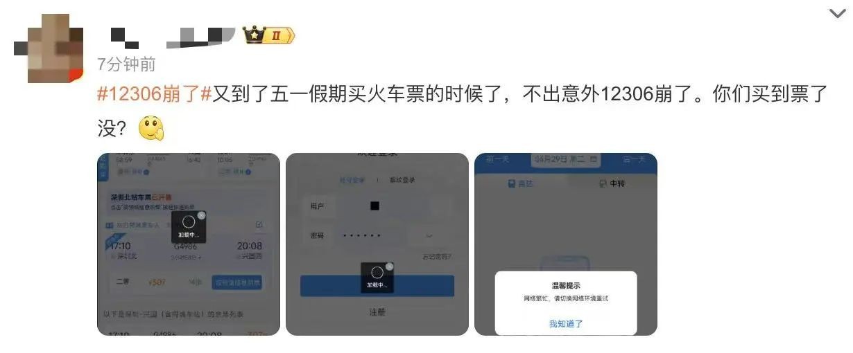 不少网友在社交媒体上表示,今天打算购买4月30日的车票,却发现12306出现无法正常登录、购票卡顿、订单显示异常等问题。