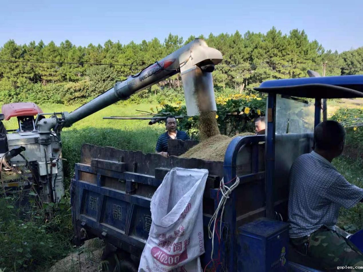 (图为收割机收割稻谷现场)