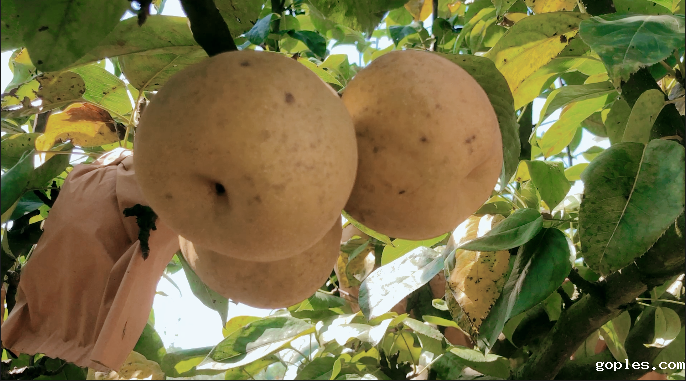 金甲梨园负责人说:"梨园的果树生长全程都采用的是自然农法,不使用农药和除草剂。但今年雨水较多,所以脆梨的色泽不如往年。"但笔者观察到,梨园树上的金甲脆梨依然金黄,果型圆整光滑。前来采摘脆梨的游客刘先生表示:"梨子很甜,汁水也很多,吃了还想多带几斤回去"。