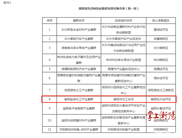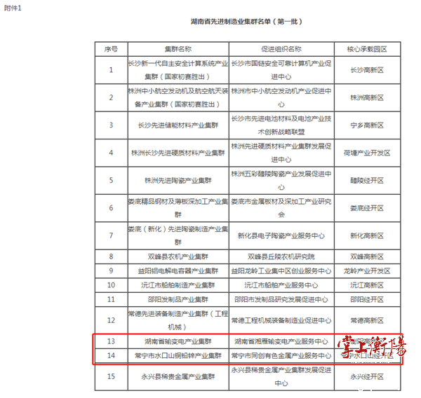 9月2日,省工信厅官网公布省产业集群及培育对象(第一批)名单,输变电产业集群、常宁市水口山铜铅锌产业集群获评省先进制造业集群,衡阳盐卤化工产业集群获评省先进制造业集群培育对象。同时,输变电产业集群将代表湖南参加国赛。