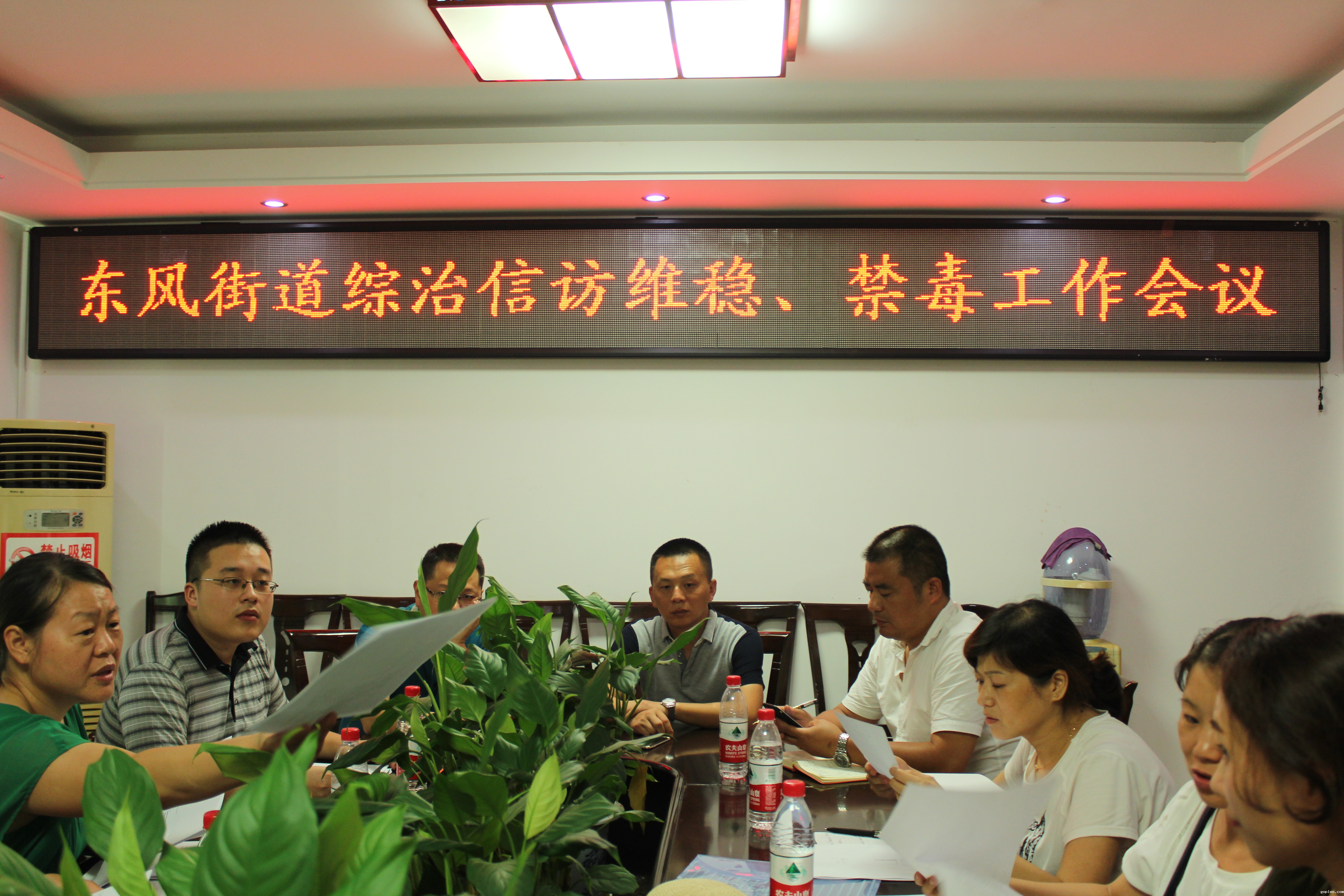 7月24日下午,东风街道在街道四楼会议室召开东风街道综治信访维稳暨禁毒工作推进会。街道党委副书记、办事处主任雷华,街道综治办、司法所及各社区书记主任、综治专干参加会议,会议由人大联工委主任郭付清主持。