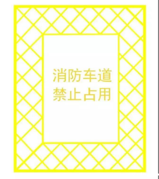 在单位或者住宅区的消防车通道出入口路面,按照消防车通道净宽施划禁停标线,标线为黄色网状实线,外边框线宽20厘米,内部网格线宽10厘米,内部网格线与外边框夹角45度,标线中央位置沿行车方向标注内容为"消防车道禁止占用"的警示字样(示例如下);