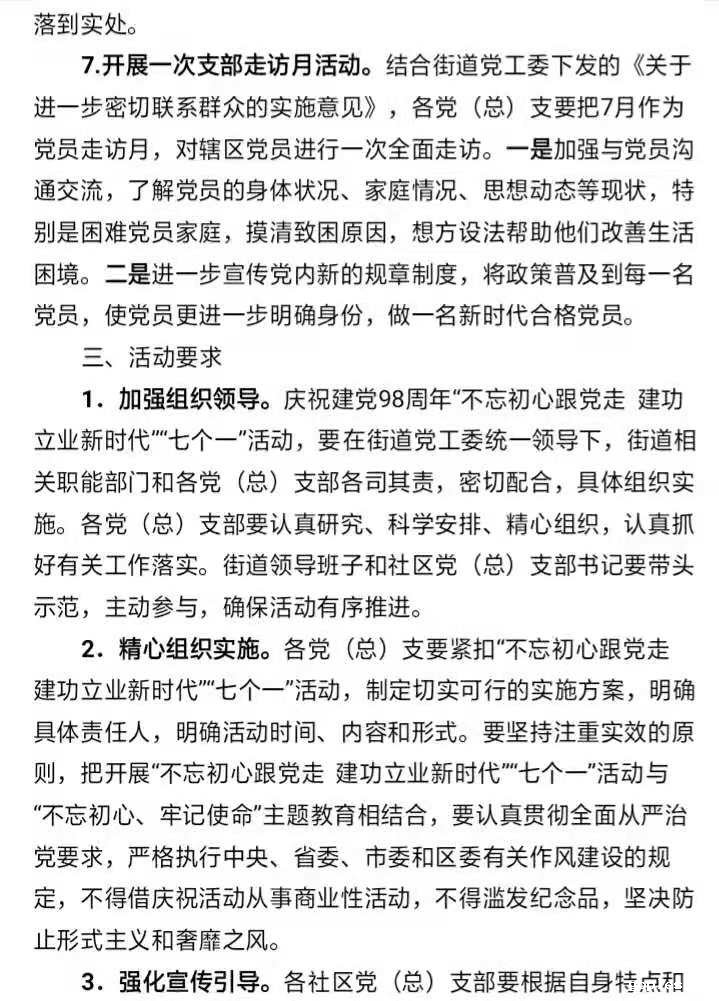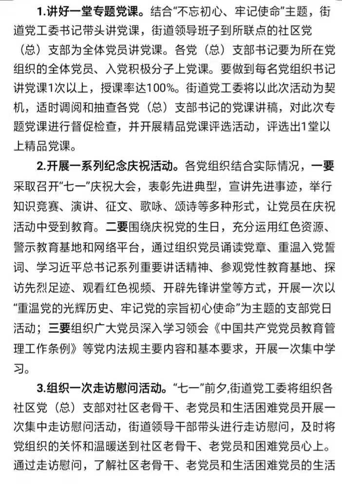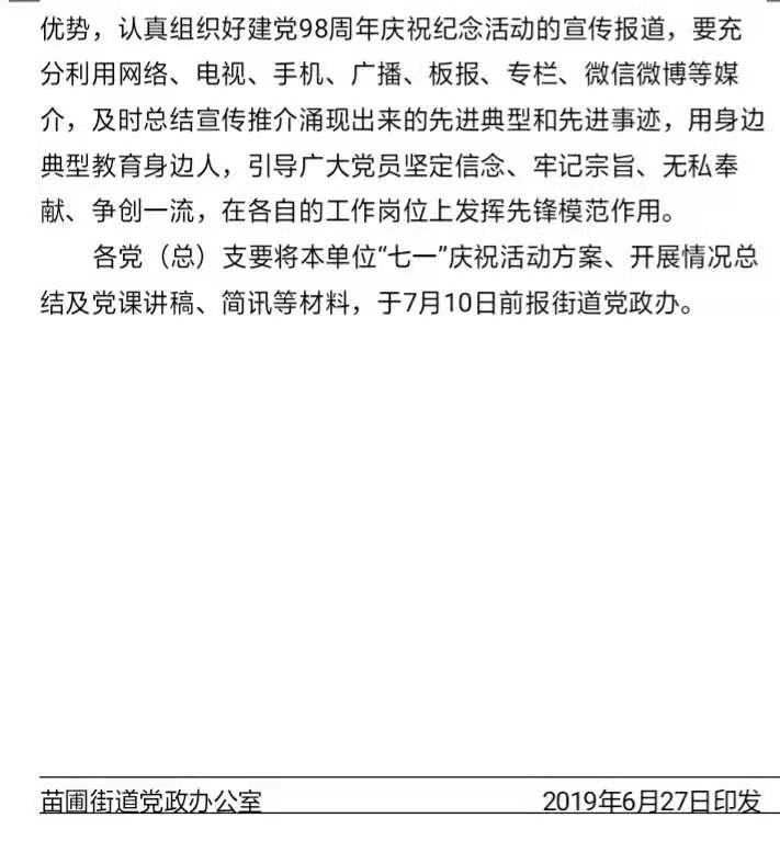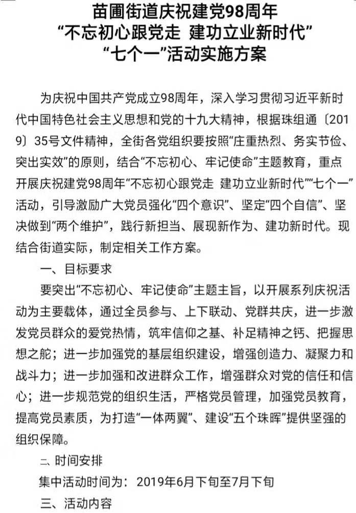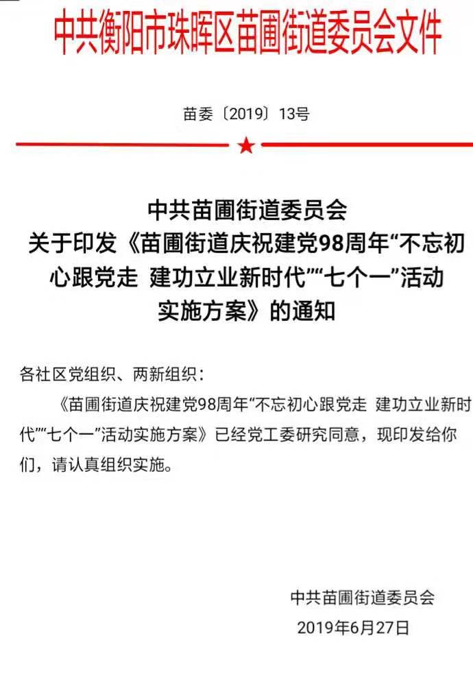 关于印发《苗圃街道庆祝建党98周年“不忘初心跟党走 建功立业新时代”“七个一”活动实施方案》的通知