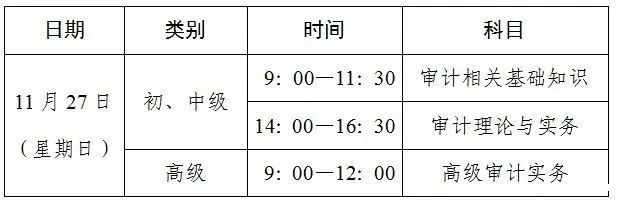 2022年度审计专业技术资格考试暂停考试地区补考安排在11月27日举行。补考范围为暂停考试地区已报名缴费人员,补考时间安排如下: