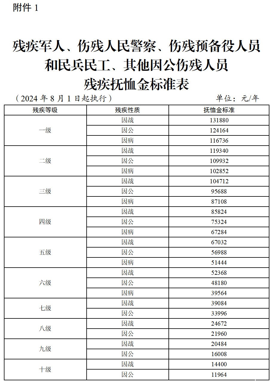 附件:1.残疾军人、伤残人民警察、伤残预备役人员和民兵民工、其他因公伤残人员残疾抚恤金标准表