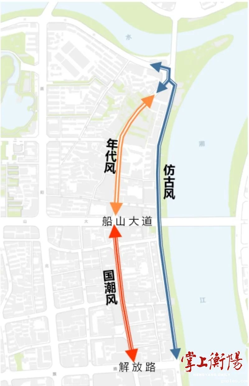 项目将依托解放路商圈、城基巷特色年代风建筑群和石鼓书院等资源,打造由南至北串联沿线的“国潮风”创意商业区、“年代风”文创文旅区、“仿古风”文化旅游区,形成穿越石鼓老城区的“千年一脉”。
