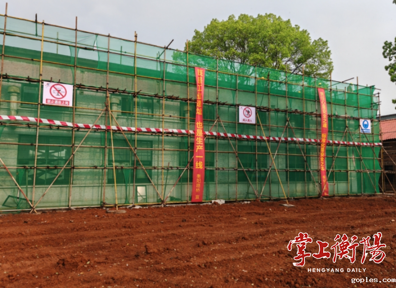 4月7日,建湘工业文化街区项目现场“热辣滚烫”,一队施工人员正在楼体外围搭建脚手架。不远处的南侧停车场上,机械轰鸣,工人们正在紧张地忙碌,铺设碎石垫层。