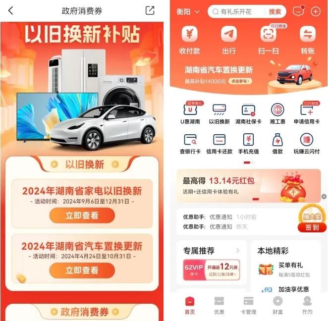 在云闪付平台首页搜索“以旧换新-2024年湖南省汽车置换更新-衡阳入口”申请补贴。置换更新有资金额度限制,先到先得,发完为止,本轮已投入汽车置换资金5500万元,请消费者在购车前留意补贴的余额。