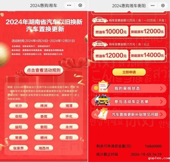 个人消费者在湖南省内转让(变更除外)2024年9月5日前登记在本人名下的家用汽车,并在湖南省内汽车销售企业购买家用乘用车新车的。转出的旧车必须是本人名下小型轿车或小型普通客车,购买的新车必须是小型、微型(九座以内)家庭自用的非营运客车(含皮卡)。购置新能源乘用车最高补贴14000元,燃油乘用车最高补贴12000元。补贴以电子红包形式发放。